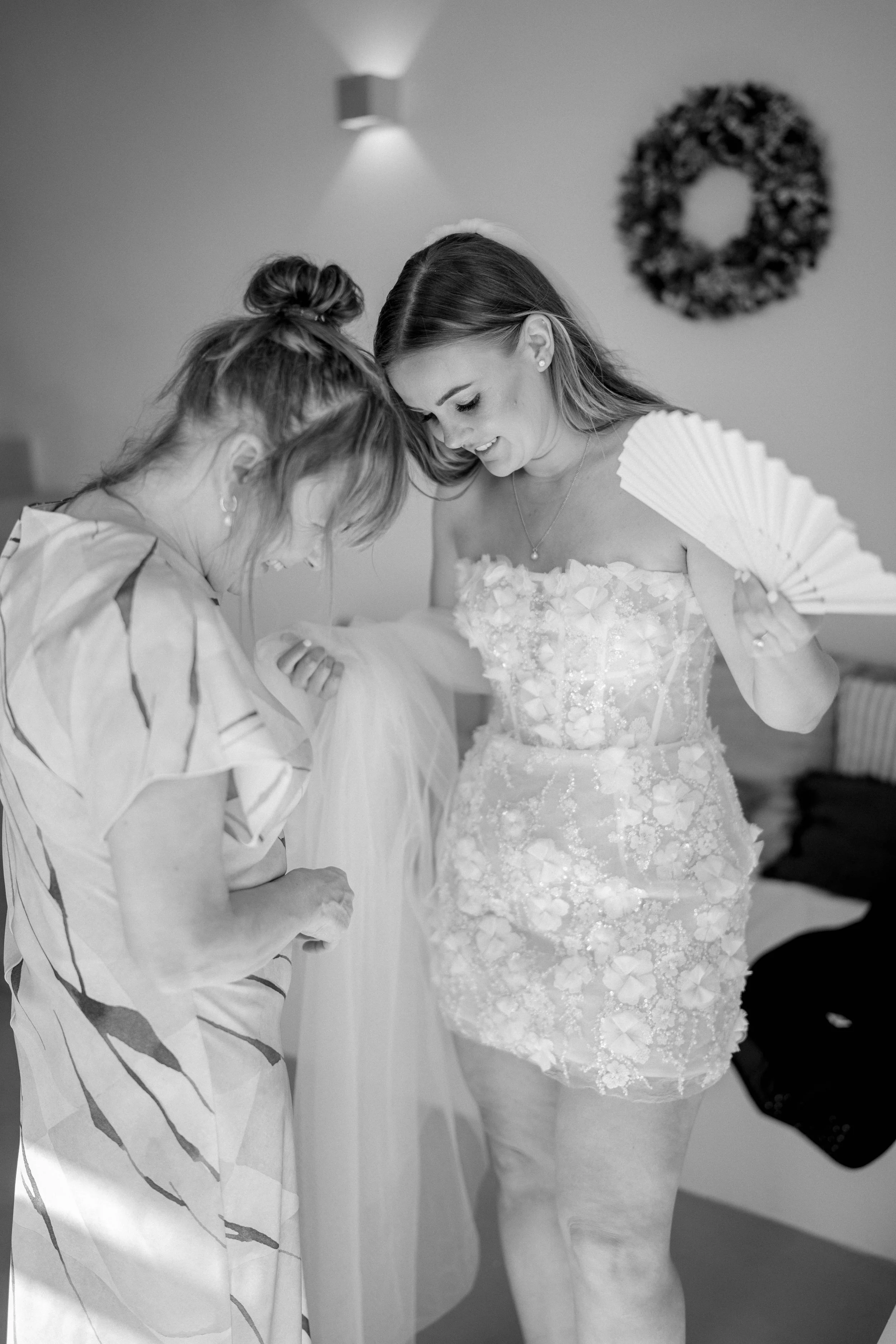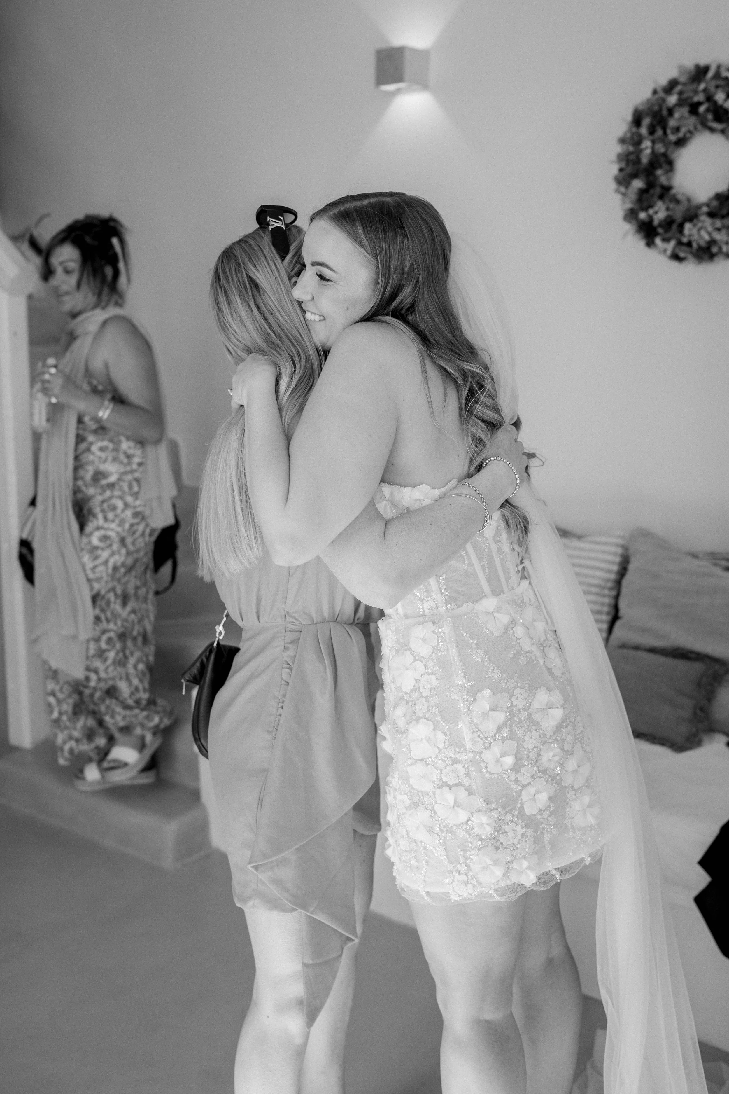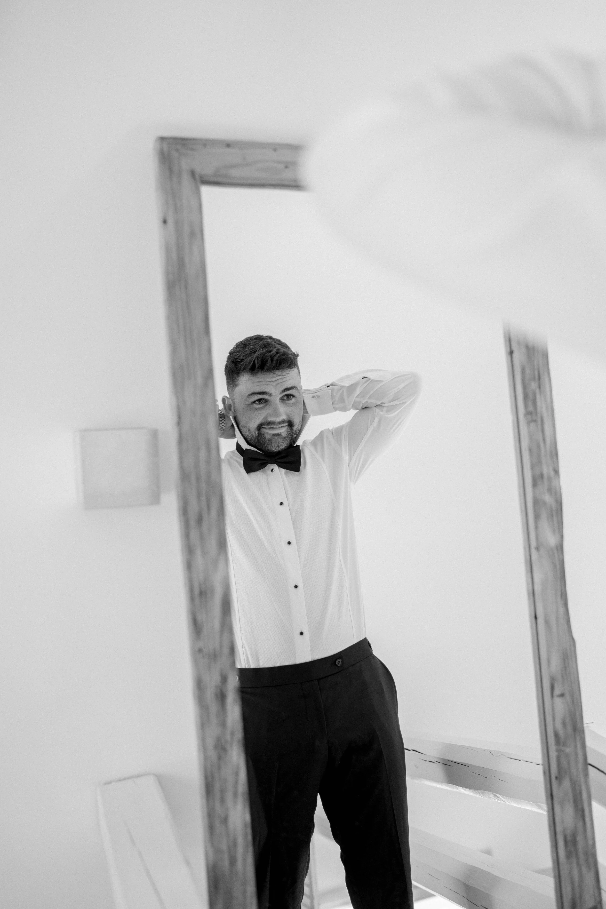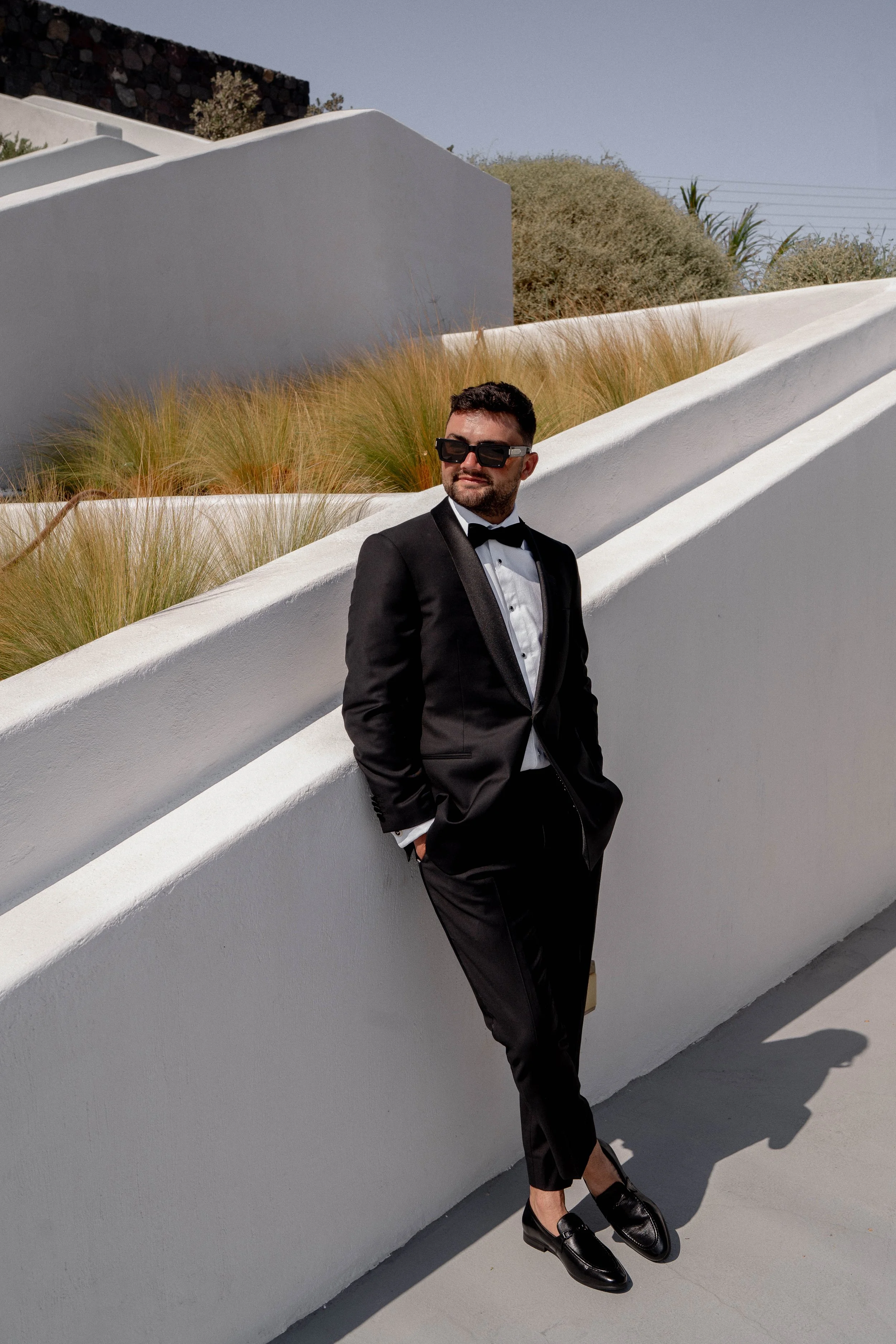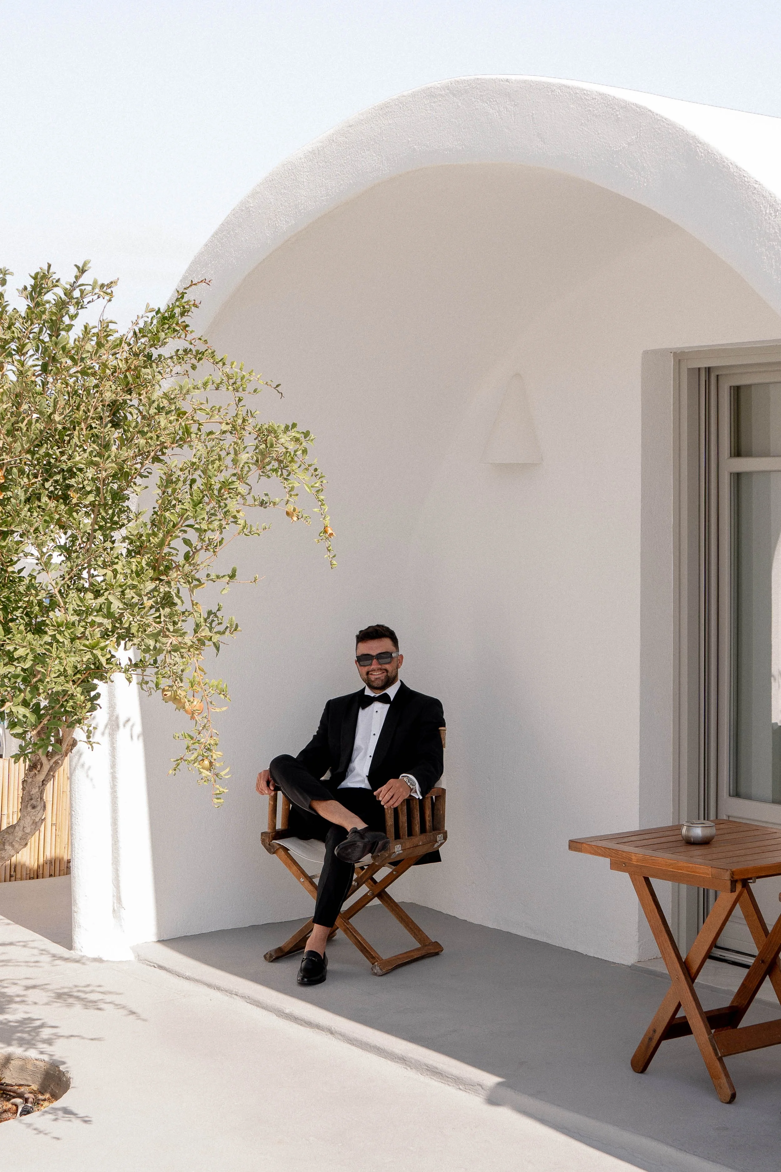 The morning of our wedding was calm and peaceful, just the two of us, enjoying breakfast, coffee, and a sunrise in Santorini. It was pure magic. Later, while my sister and I were busy getting our makeup and hair done, the boys were swimming, snacking and sunbathing by the pool – it was such a relaxed vibe. I got ready wearing the “Rosie” set by New Zealand designer Caitlin Crisp. It was the comfiest, most stylish little set I could’ve asked for.