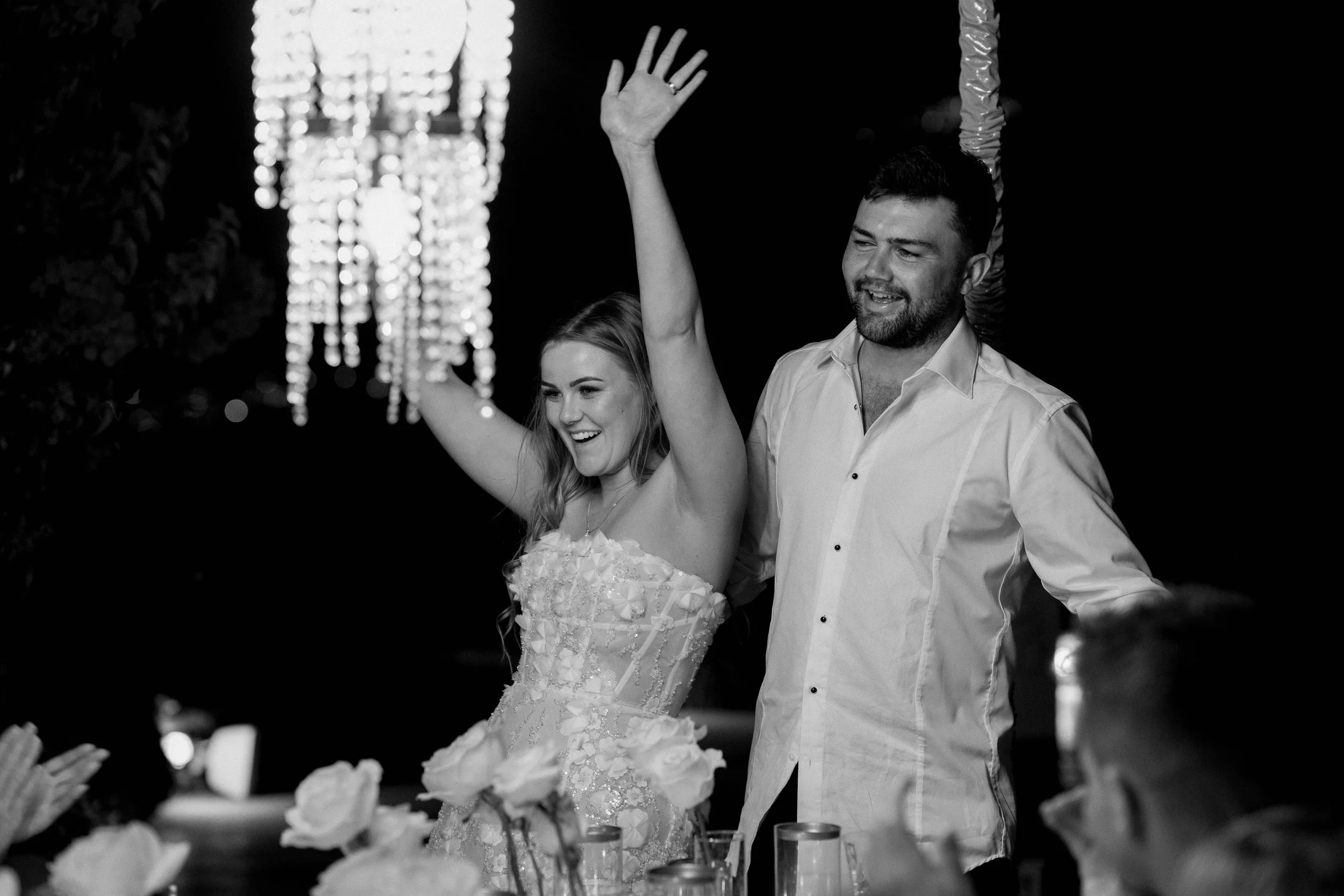 A cake-cutting and a Champagne tower kicked off the festivities at the reception. The vibe we envisioned was timeless, elegant, and romantic, with lots of white florals and candles, with soft, modern details. The large chandeliers helped the simplicity of the table set-up shine – I’m a minimalistic girlie so kept it very simple and it turned out perfectly.