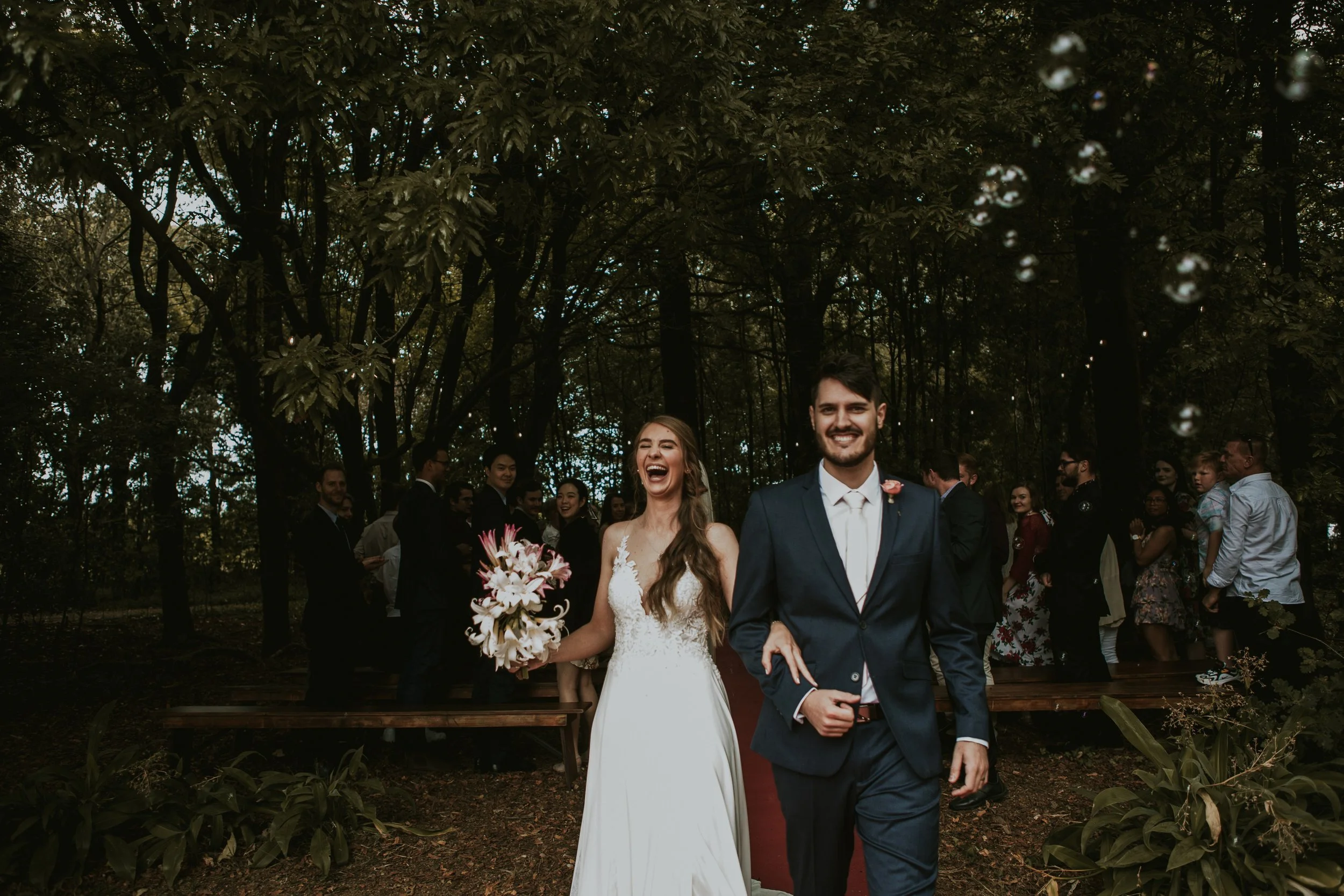 We decided to have our ceremony under the beautiful canopy of the trees, which was a good choice in hindsight as it began to lightly rain when the ceremony started. They say it’s good luck to have rain on your wedding as well, with an overcast day being great for photos. We wanted all our immediate family members to have a sense of inclusion in our ceremony, starting with my dad walking me, and Rourke walking with his mum up the aisle. All our siblings were in our wedding party, our mums wrote poems to speak during the ceremony, and we had my sister and Rourke’s dad as our witnesses. A sign language interpreter was also present from the ceremony to the speeches, making sure that Rourke’s step mum felt a sense of inclusion. We wrote our own custom vows supported by our wonderful celebrant Viv Pearse, weaving a story of our relationship for our guests, which brought out much laughter.