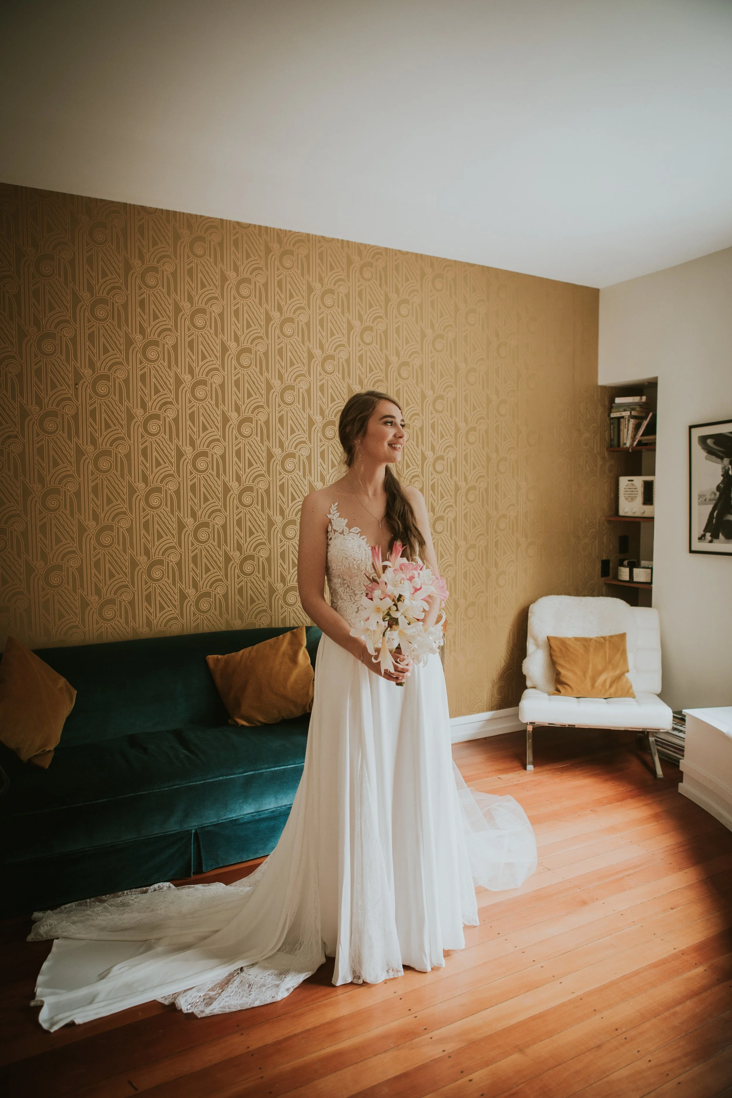We wanted to put our wedding budget towards meaningful items and chose a lot of items we would reuse, resell or were purchased second hand. This helped to support the rustic theme we had chosen and also worked with the furniture already at the venue. One of my bridesmaid’s mum has a beautiful garden full of gorgeous greenery and flowers, and she’d been saving them especially for our wedding. She helped to create my bouquet, which brought a personalised touch and strengthened the sense of family involvement that we love. Our wedding party came through in the weeks leading up to the big day, helping bring together place settings, flower design, signage, washing jars, folding napkins and more.