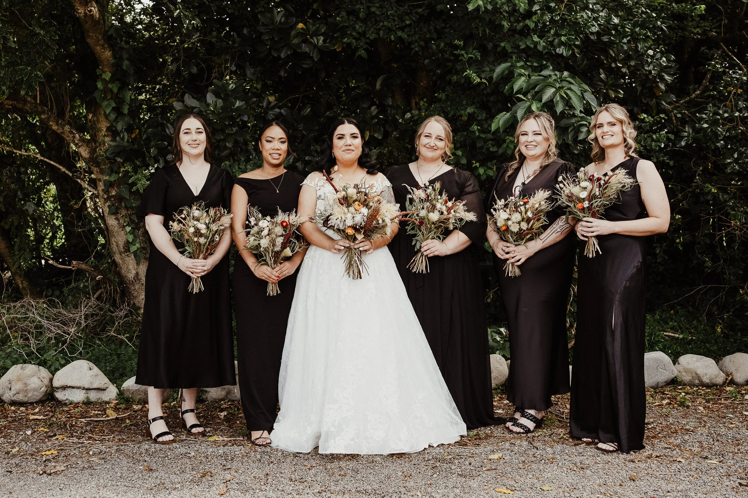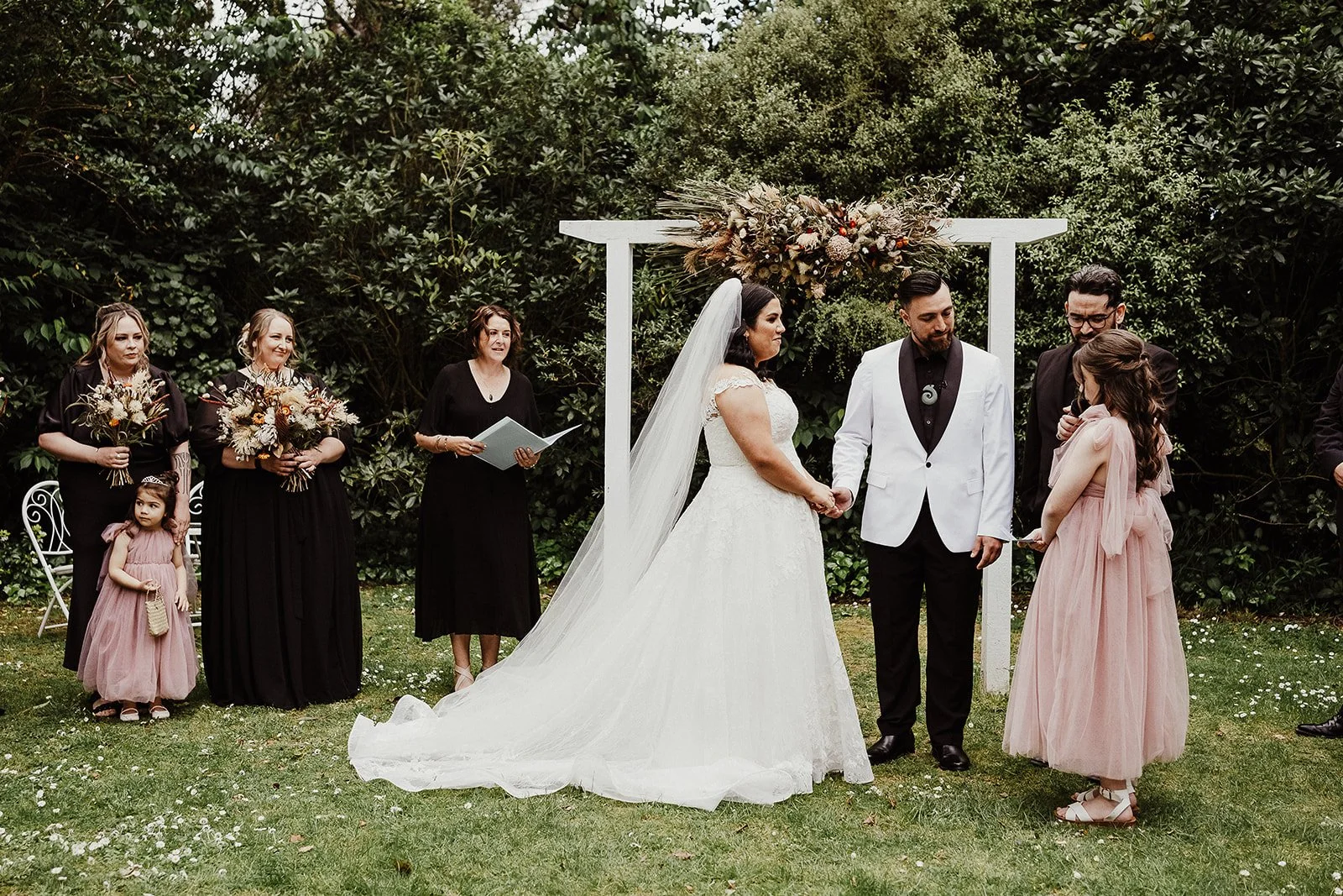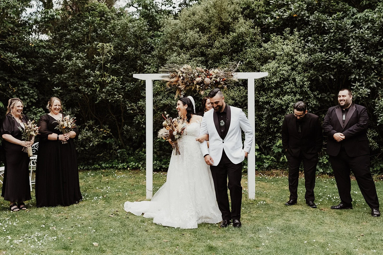 Brad chose a sharp look that worked perfectly with the bridesmaids’ black gowns. He and his groomsmen all wore black, while he stood out in a crisp white tuxedo jacket with a black lapel from Johnny Bigg. His pounamu was such a meaningful finishing touch. On the morning of the wedding, he surprised his groomsmen with their own pounamu, each specially crafted by local Māori artist Dean from Kuru Pounamu. That thoughtful gesture also explained why he’d been so insistent about skipping ties for the ceremony!