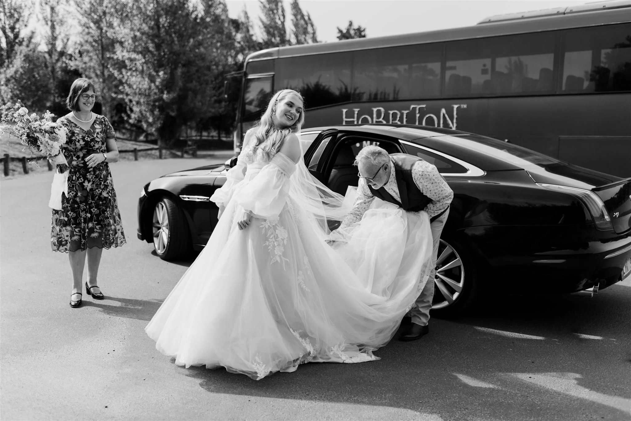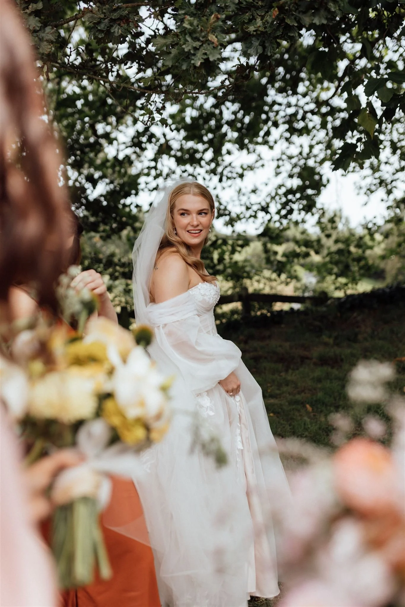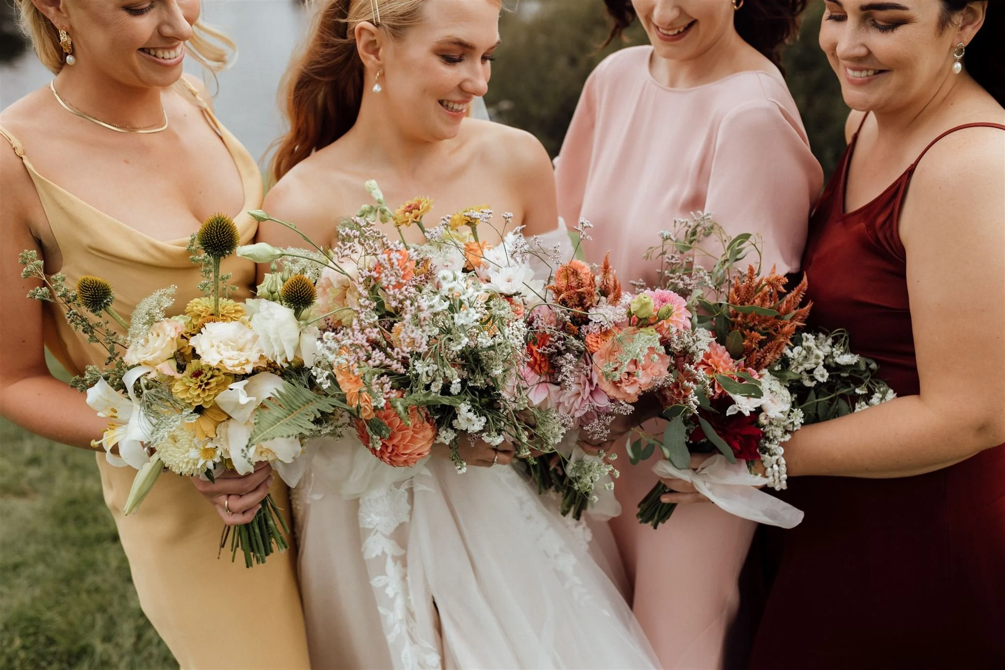 I spent many months growing a cut flower garden from scratch, focusing on dahlias, hydrangea, foliage, and wildflowers. Loved ones also contributed from their own gardens, with one special dahlia in my bouquet sourced from a bulb originally grown by my late grandmother, Kathleen. These were (very carefully!) driven up from Wellington to Cambridge in big buckets of water, and supplemented with purchases from a local flower farm. The bridesmaids and I each put together our own bouquets the night before, and you can see all of our creative personalities coming out in the way they look. Some more structured, some more loose and whimsical. It was a special part of the day to have my girls’ individual creativity captured, and it was a wonderful activity for us to share together before bed.