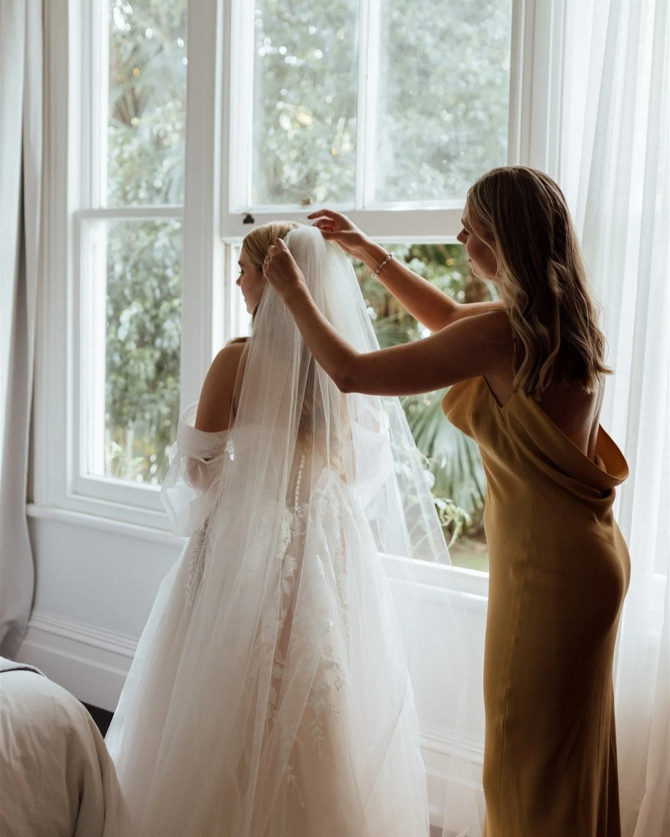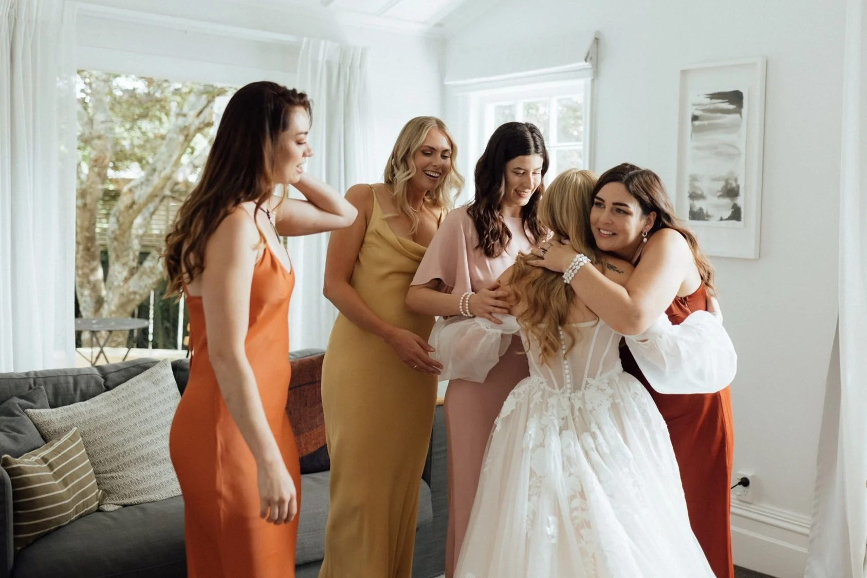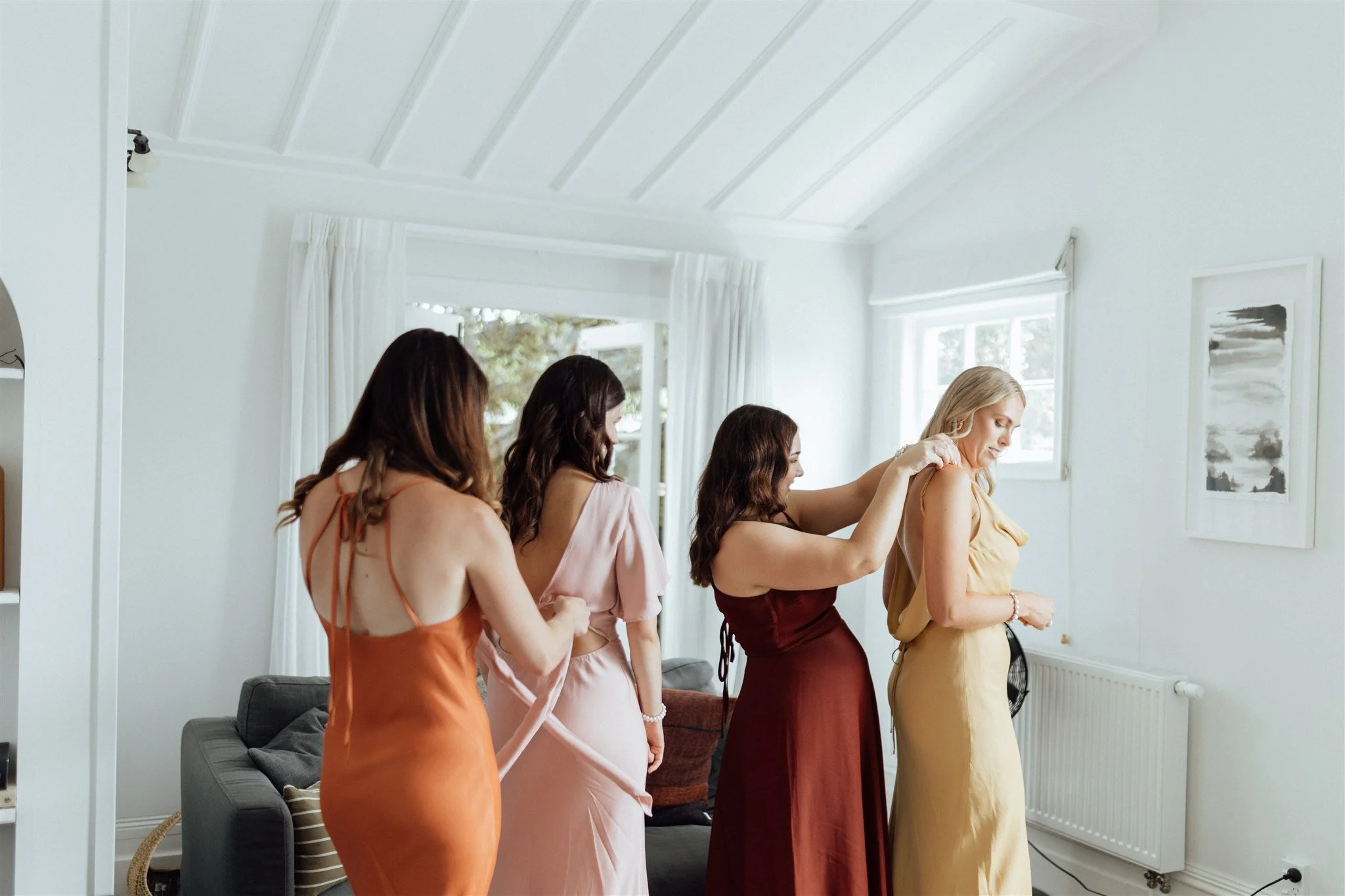 We gathered with the bridal party first thing in the morning to share breakfast - this helped us shake off some nerves and feel a bit more normal! Luke and the boys headed back to their accommodation to chill and play some backyard cricket, while the girls and I took the morning to slowly set up, get ready, and soak up the entire experience. My girls gave me a few heartfelt notes and gifts, and we video called another would-be bridesmaid that couldn’t be in the country. It was important to me that getting ready felt the same as all the times I had gotten ready with my girls before an event or night out - a mess of shared products, scattered mirrors, and an experience full of laughs, love, and helping one another.