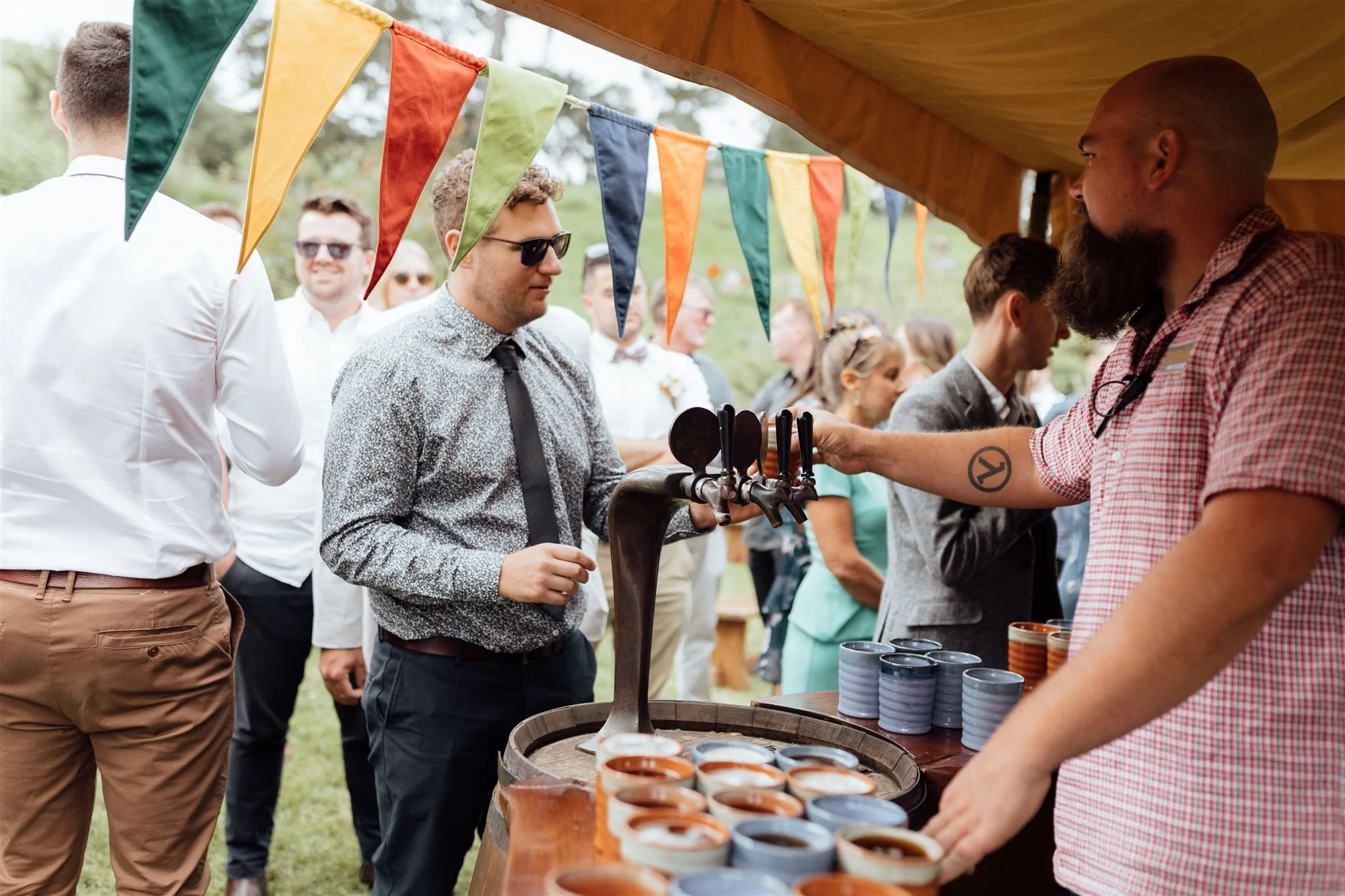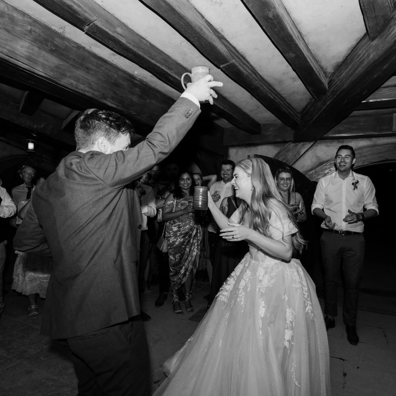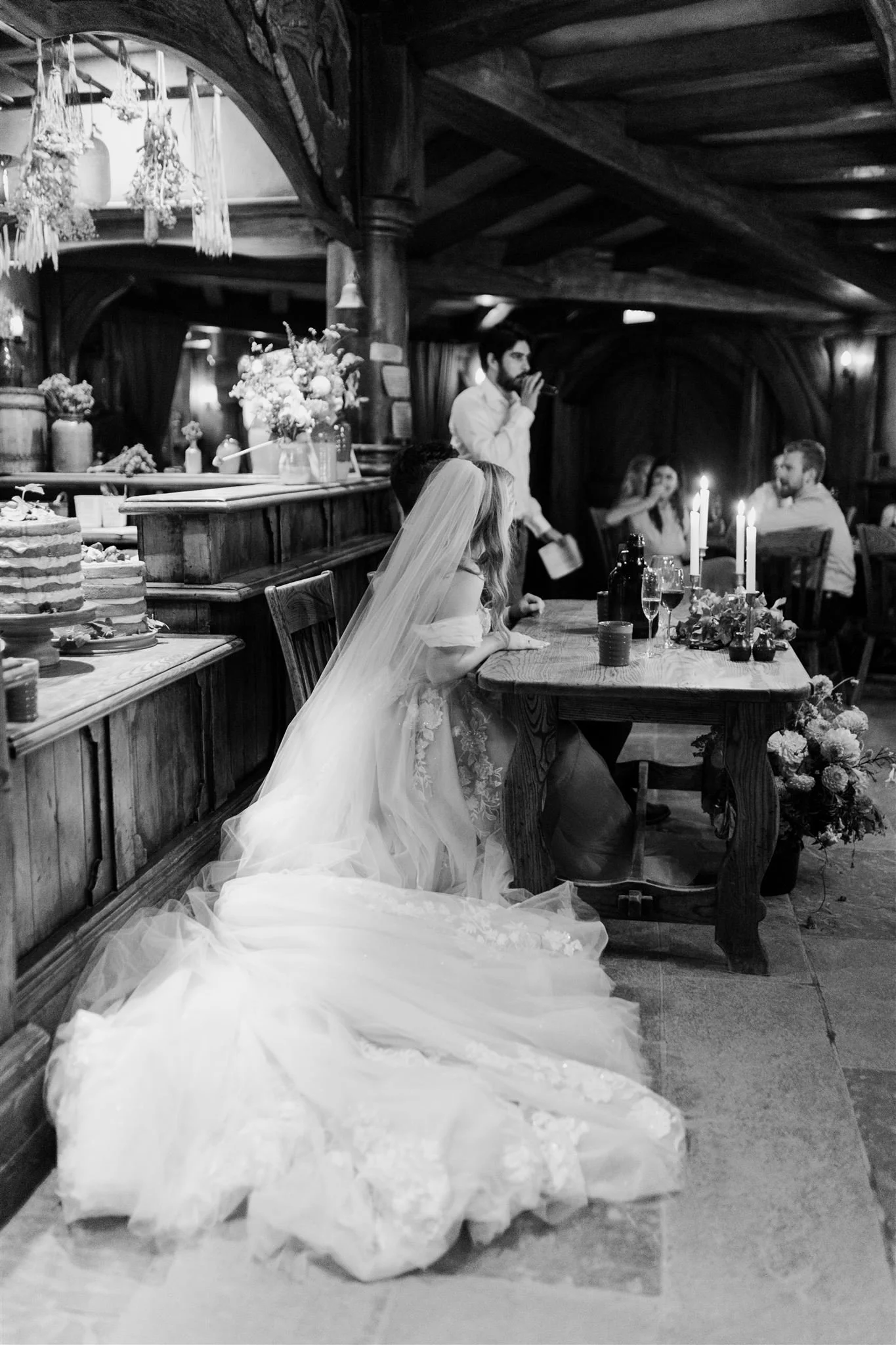 Because our timeline was very packed, we sneakily scheduled to have our dinner served picnic-style out by the lakeside, while our guests ate and socialised inside! These moments for the two of us were very special, and let us soak up the beautiful venue and our newlywed status under a beautiful pink sunset. Our reception was held in the one and only Green Dragon, and for our first dance we performed Merry and Pippin’s rendition of Brew for the Brave and True from The Return of The King, complete with full mugs of “ale” to down at the end (actually just water - we weren’t keen on any stains from spills!). We knew we’d feel awkward dancing romantically in front of everyone and really just wanted to kick off the dance floor with something upbeat and a bit silly! Our guests got involved clapping along with the beat, and some even tried to sing along using lyric sheets we provided. At the end of the night, guests were rounded up onto coaches and we were left to slow dance to one of our favourite songs just the two of us in an empty venue - that’s when the happy tears really flooded out!