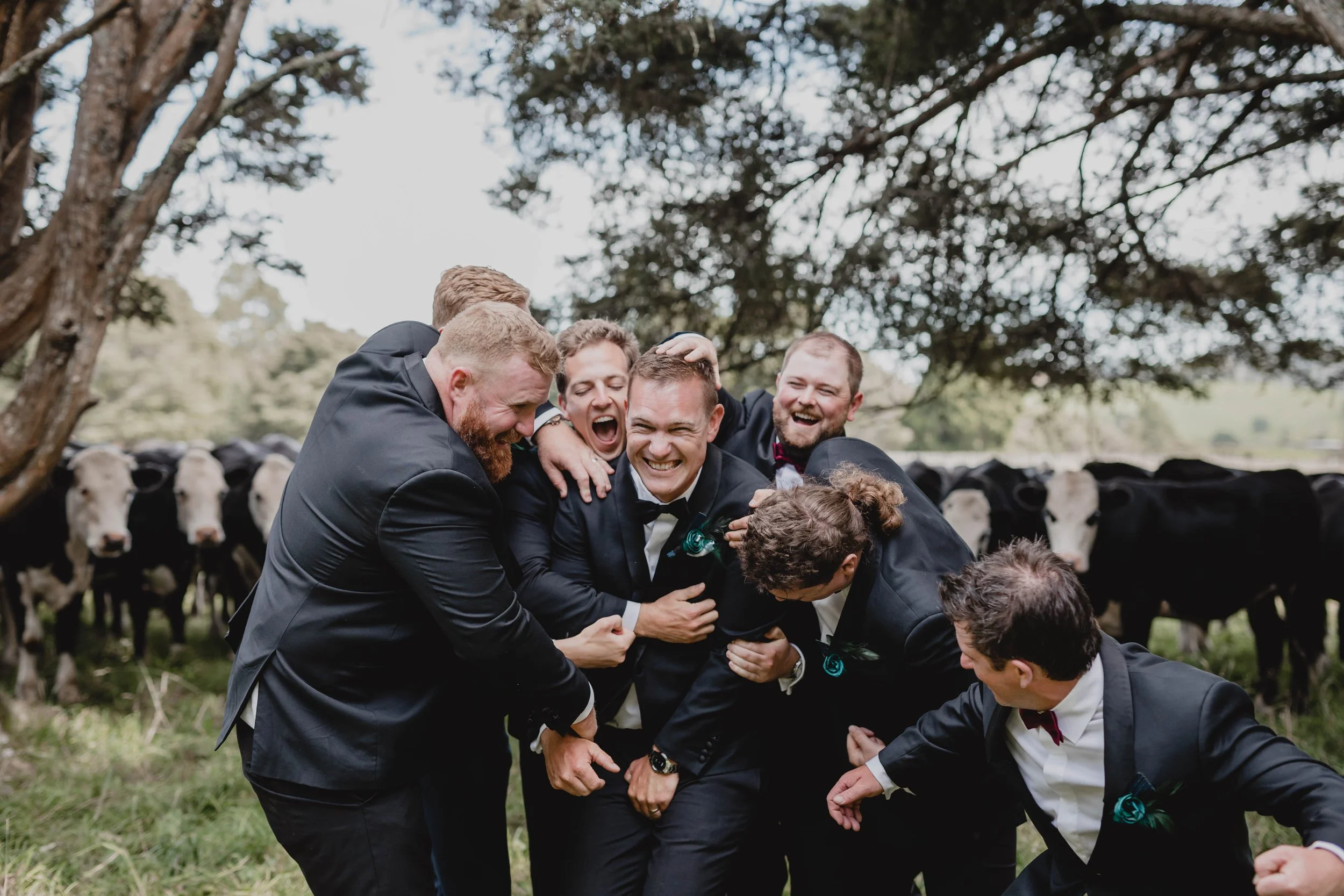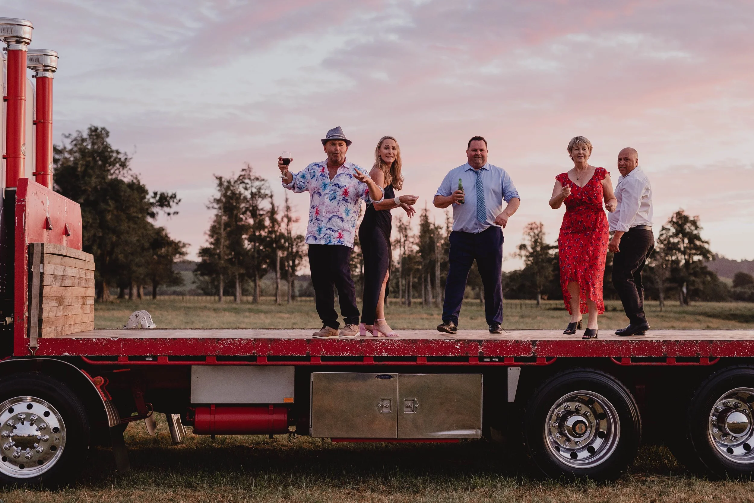 ‘Our wedding day was spectacular and ran very smoothly. Team Bride were getting ready down the road at Aunty Netty's house, whilst Team Groom got ready at the house on the farm. The ceremony started at 2pm, followed by cocktail hour, including cheese platters. The bridal party went off for photos at the back of the farm, piling into farm utes where the cows decided to make an appearance during our photoshoot.’