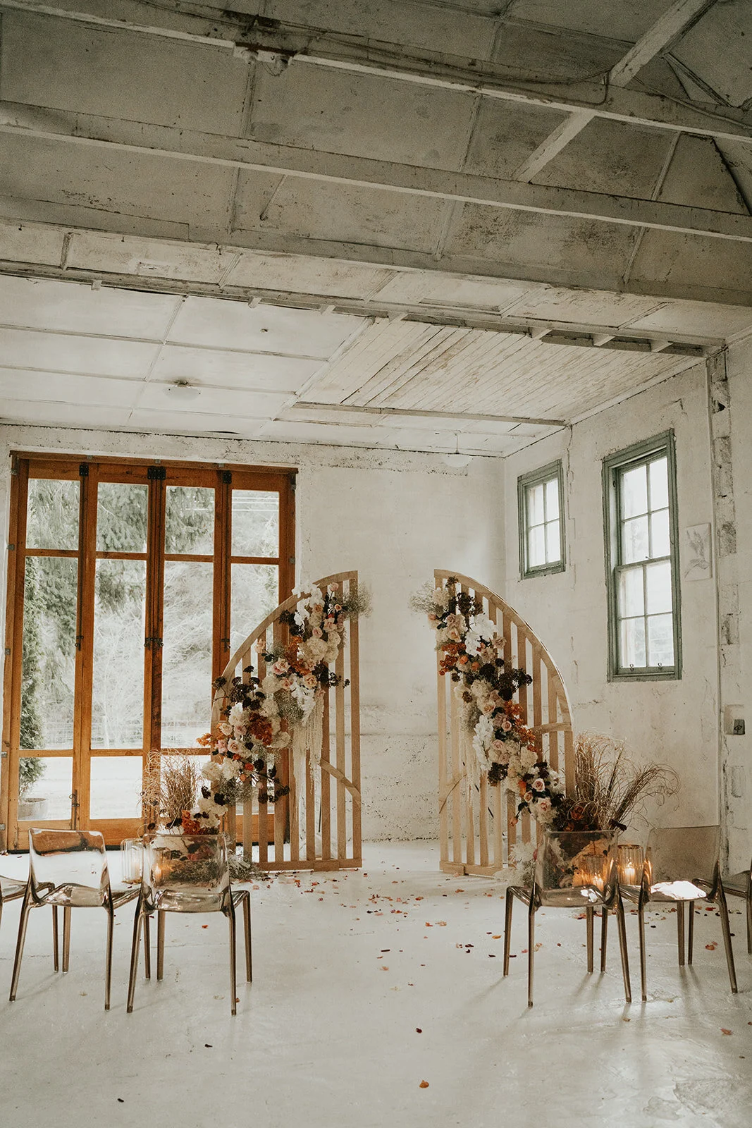 We chose to work with the Thomas Brown Art Gallery, an incredible character space for any gathering. Originally a cheese-factory, the walls are a tapestry of different building materials, from white-washed concrete and wooden beams to mint-green floating doors and the beautiful floor-to-ceiling French doors.