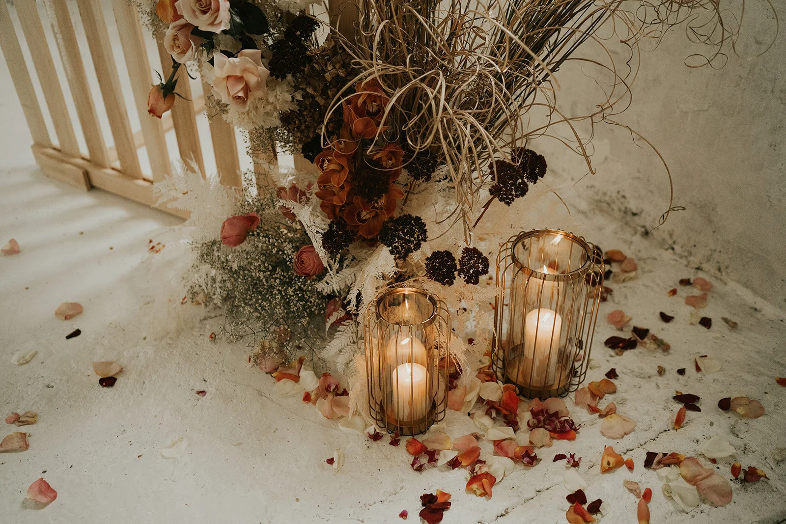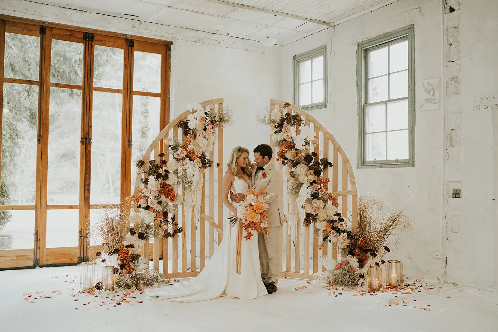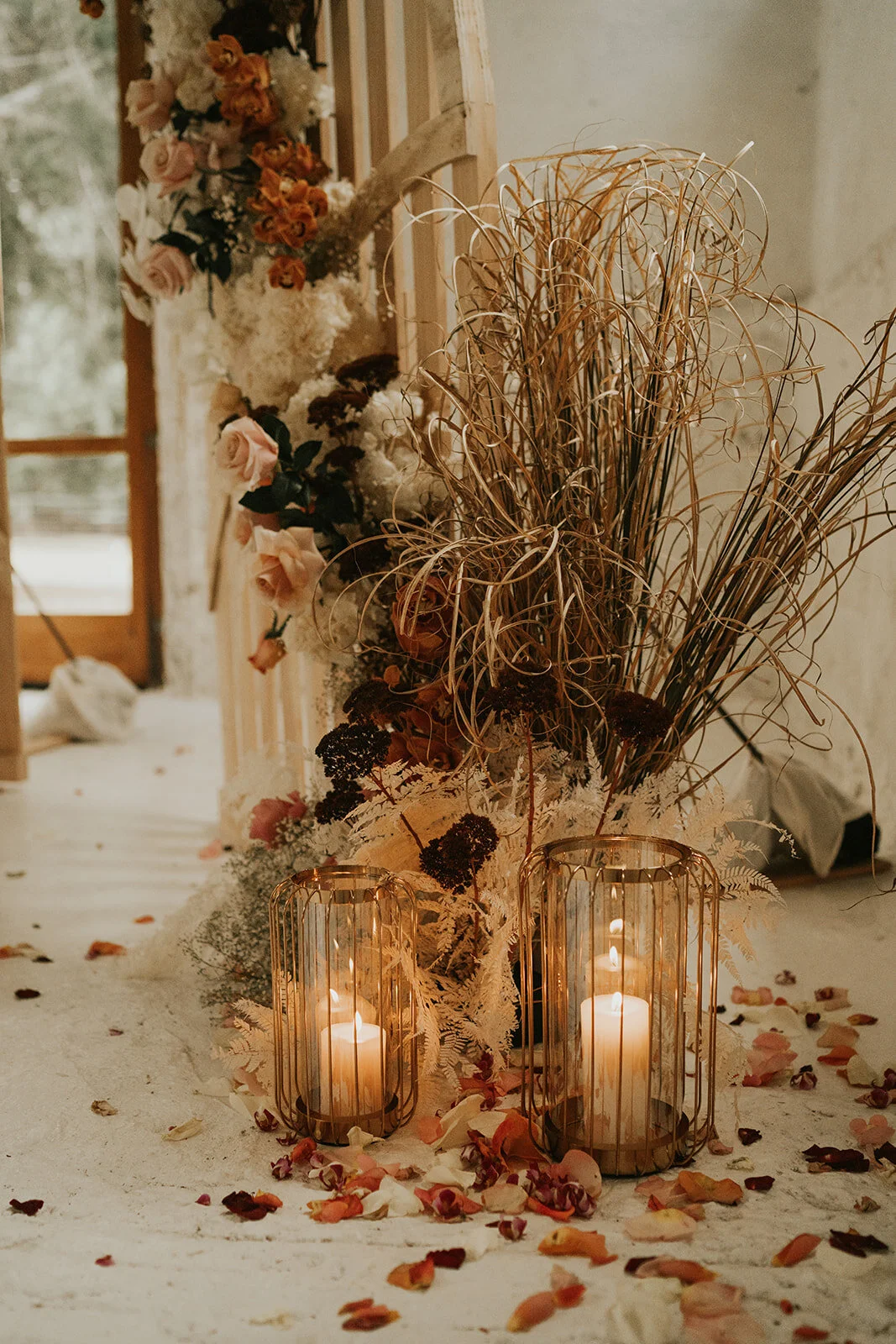 We made a slated, curved wooden backdrop that presented a nod towards the lines of a mid-century style, and then went running with that style in mind. For the flowers, we went for burnt reds, sienna terracotta and peach with some white and brown for contrast and to help the colours pop. The peach and soft pink tones of the stationery and the smokey acrylic chairs were the ideal match for a few guest seats. Gold lanterns were also tucked into the bottom of our ceremony backdrop to bring a little glam in.