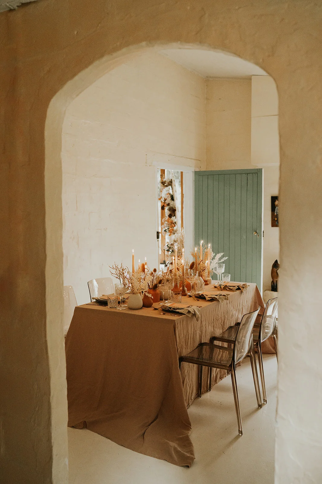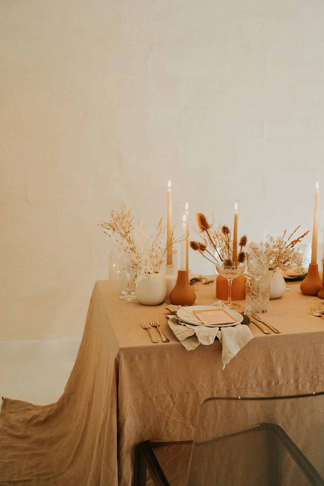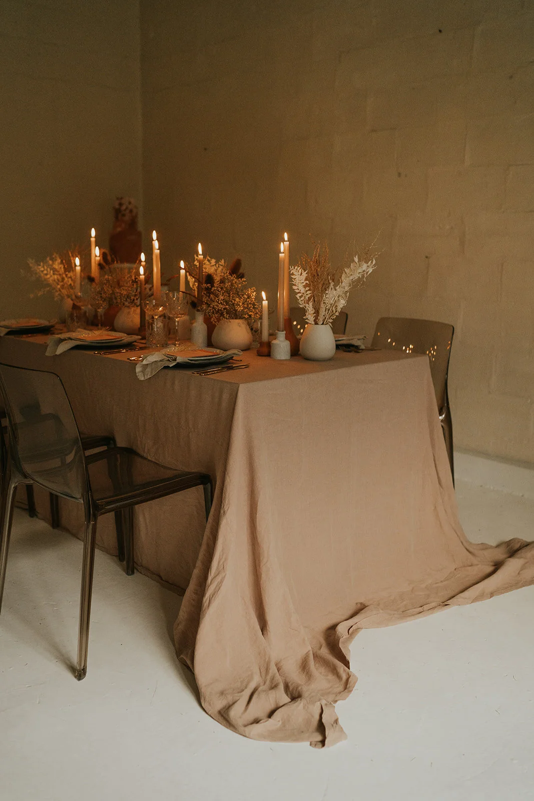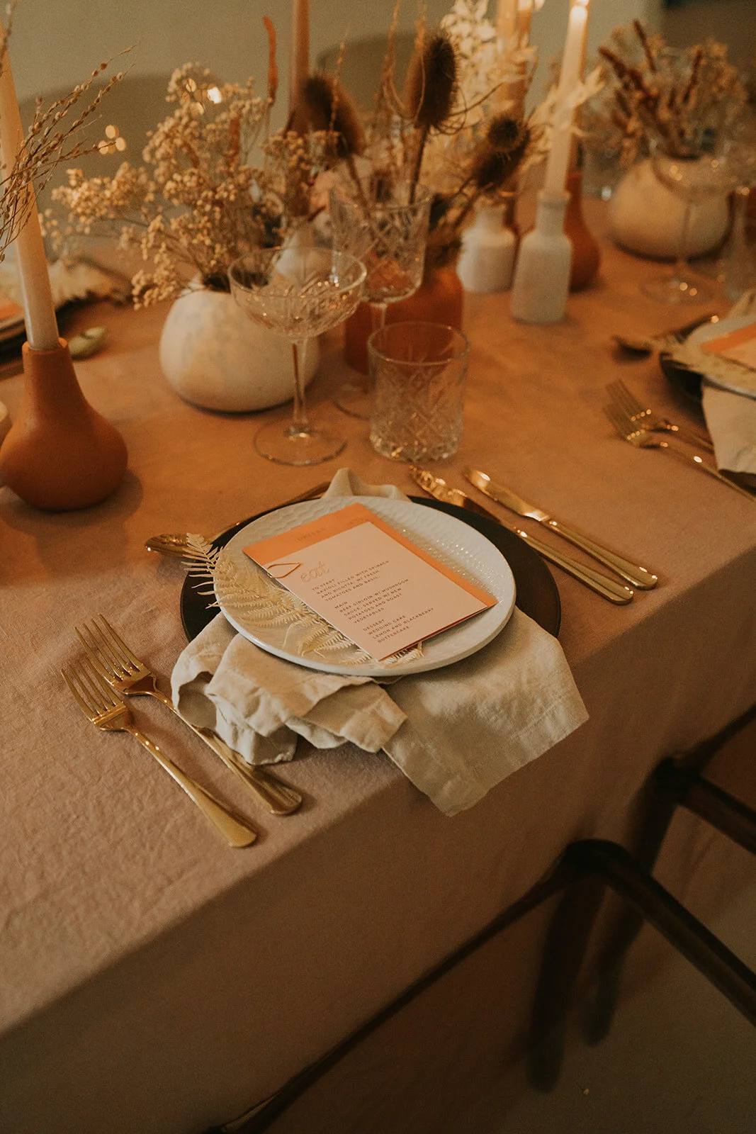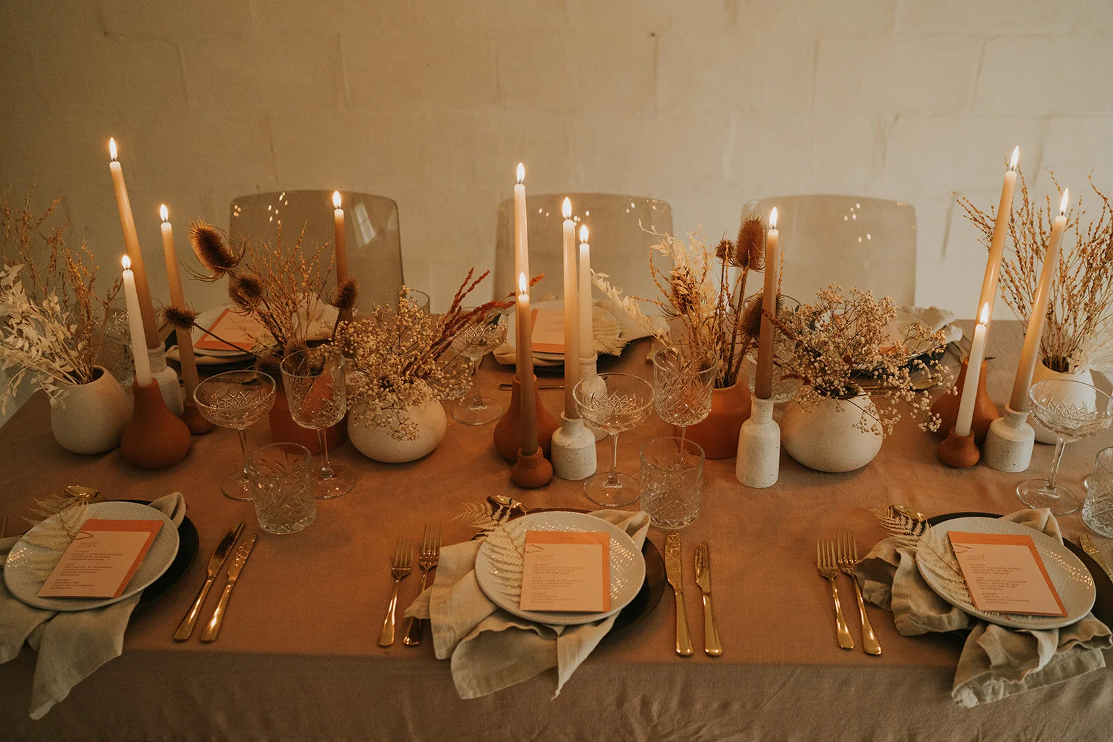 For an intimate dinner, we again centred around the idea of terracotta, peach and intriguing textures. A burnt pink linen cloth set the scene and a rich colour base, which I then styled with white honeycomb charger plates set against a black dinner plate to help the colours pop against the fabric, with a peach menu card to circle the colour back around again. We also had gorgeous nude linen napkins, gold cutlery and divine crystal glassware to complete the setting. Concrete/stone vases and candle holders in a mixture of white and terracotta were filled with textile florals like preserved ruscus and fern leaves. With a mixture of white and sand taper candles running through the centre of the table, everything came together like it was meant to be!