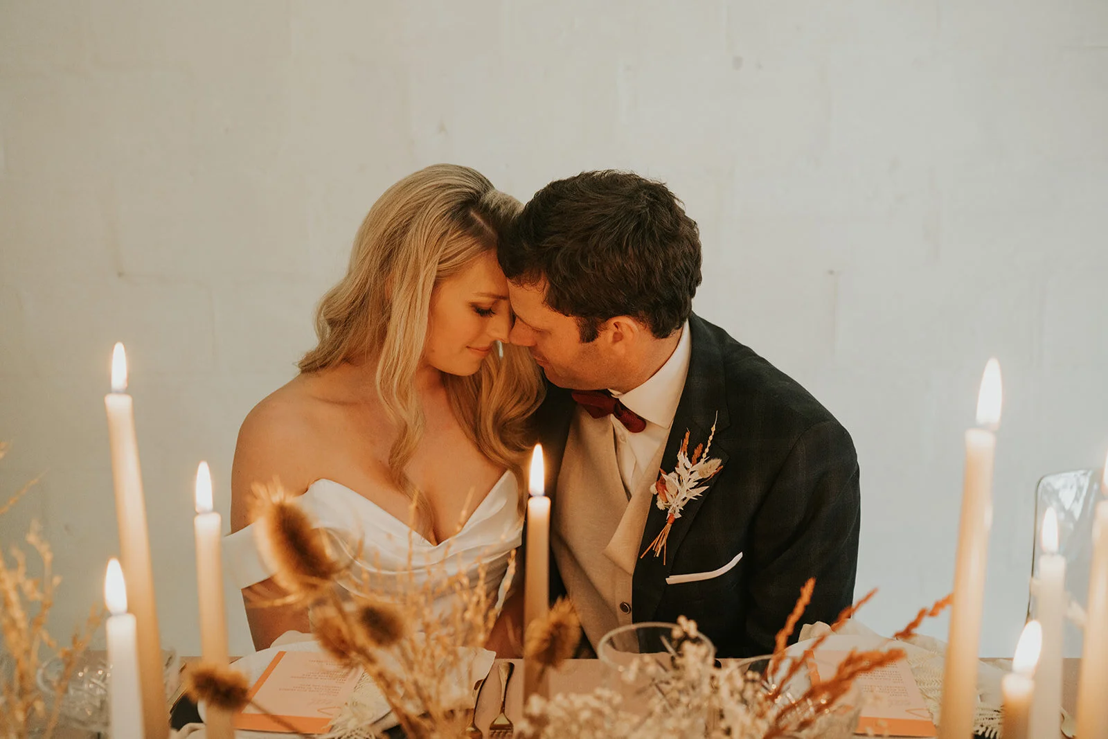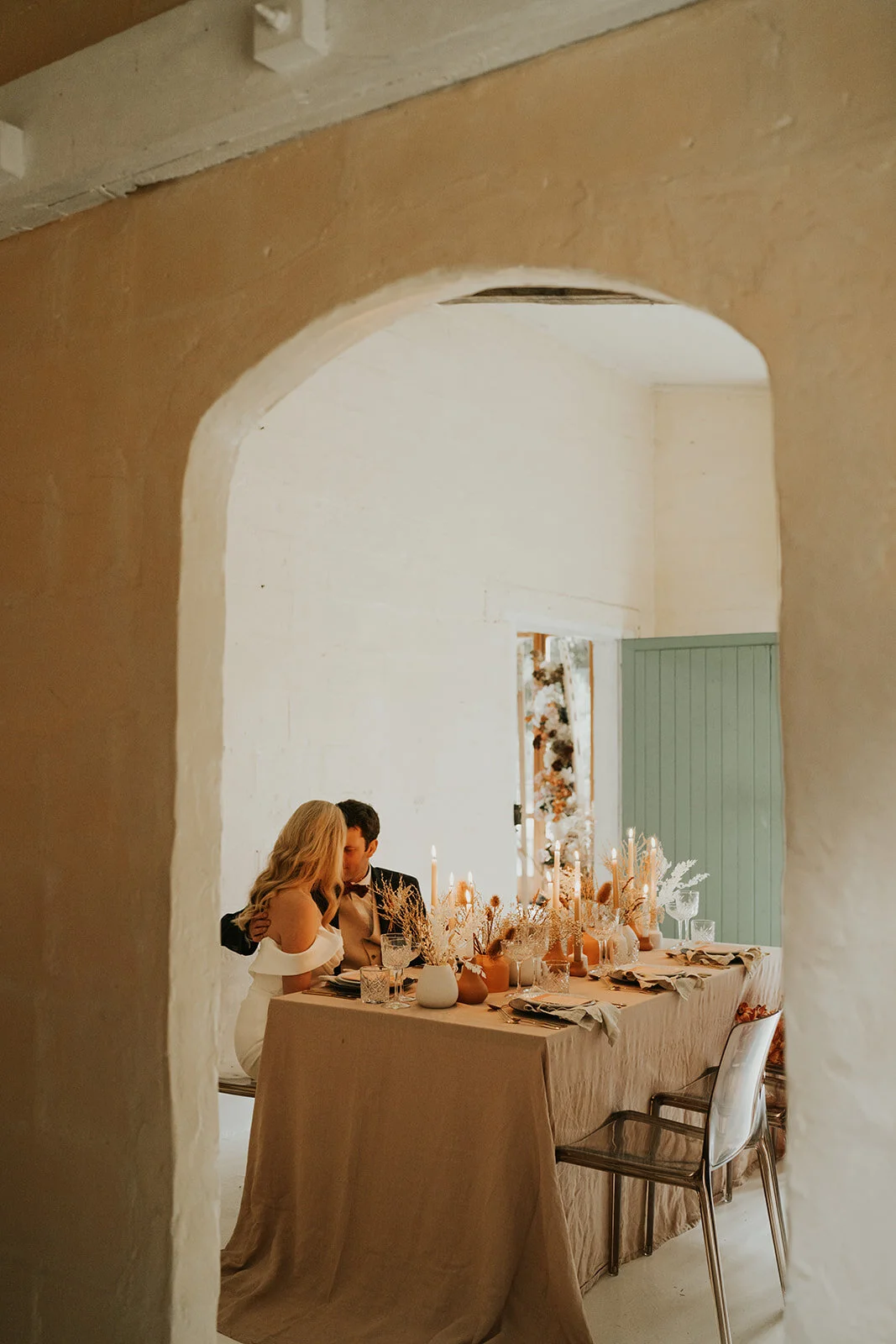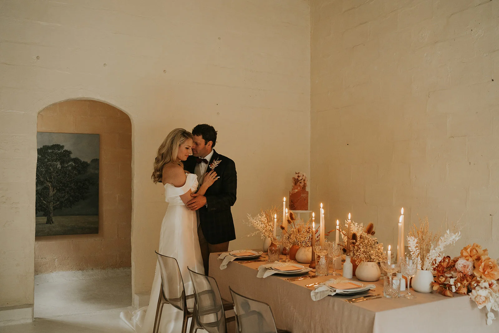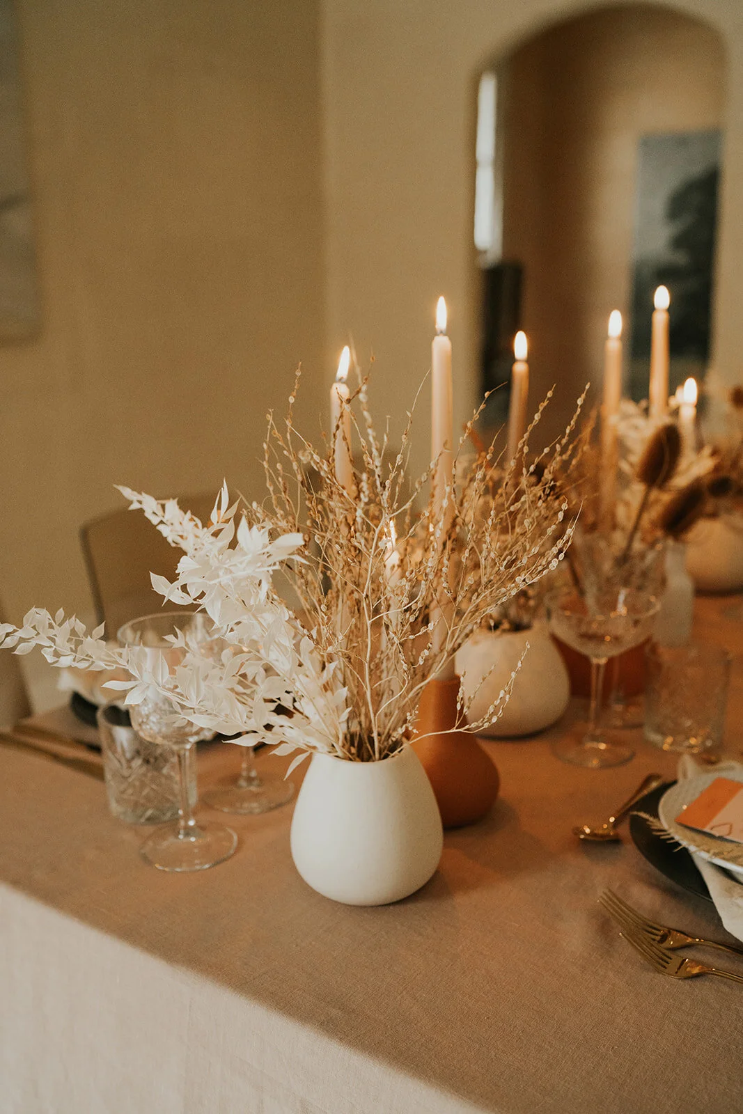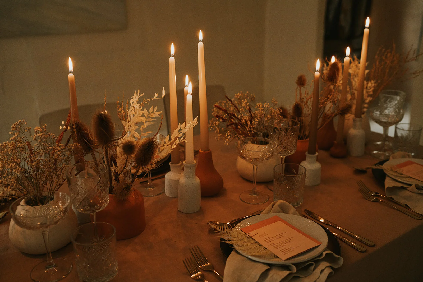 For an intimate dinner, we again centred around the idea of terracotta, peach and intriguing textures. A burnt pink linen cloth set the scene and a rich colour base, which I then styled with white honeycomb charger plates set against a black dinner plate to help the colours pop against the fabric, with a peach menu card to circle the colour back around again. We also had gorgeous nude linen napkins, gold cutlery and divine crystal glassware to complete the setting. Concrete/stone vases and candle holders in a mixture of white and terracotta were filled with textile florals like preserved ruscus and fern leaves. With a mixture of white and sand taper candles running through the centre of the table, everything came together like it was meant to be!