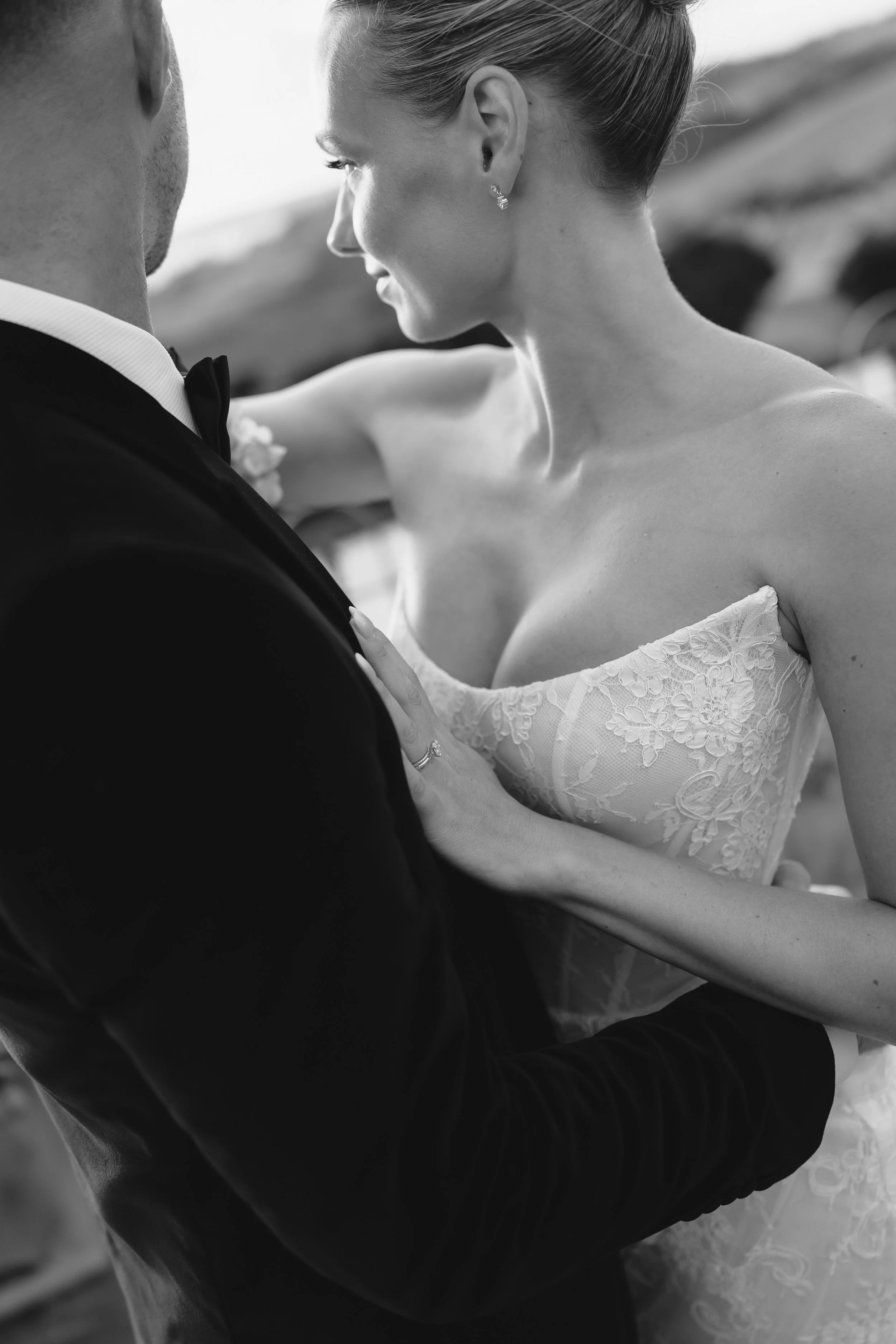 I knew I wanted to change my look for the evening, but at the same time, I didn’t want to take my dress off. I had always envisioned wearing sleeves for the ceremony, so I kept them on for that part of the day and then removed them for the reception to switch up my look. As someone who works in fashion, I wanted a designer pair of shoes to wear again to other events. I chose a pair of Prada leather slingbacks, and honestly, they were so comfortable — I ended up wearing them all night.