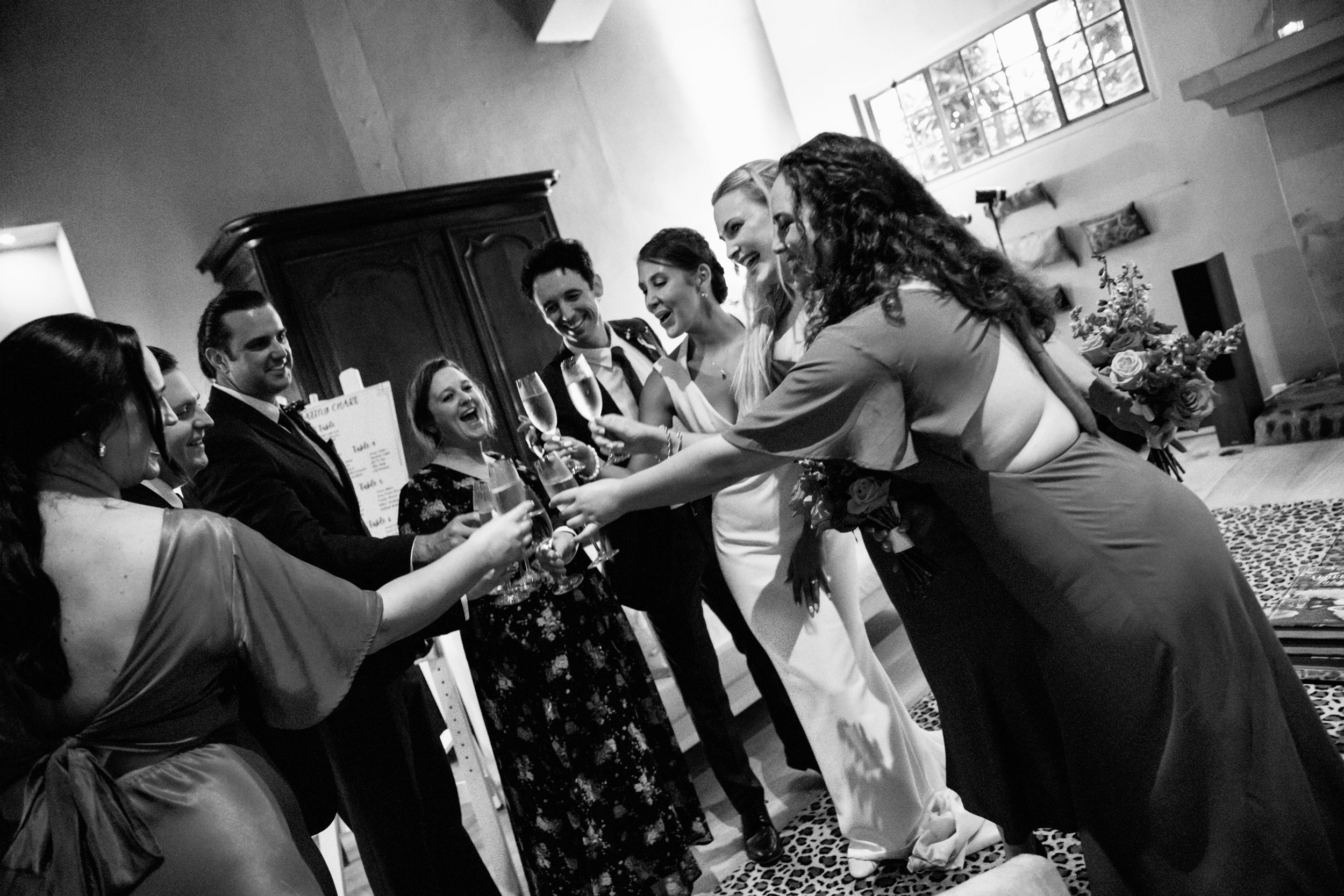 We chose to do our photos before the ceremony at Mantells, beginning with our first look. Dan turned around and popped a bottle of champagne just as I walked out to meet him. The timing of the cork was hilariously perfect, and my cousin captured the exact moment two of my bridesmaids were clapping and smiling — it’s one of my favourite photos.