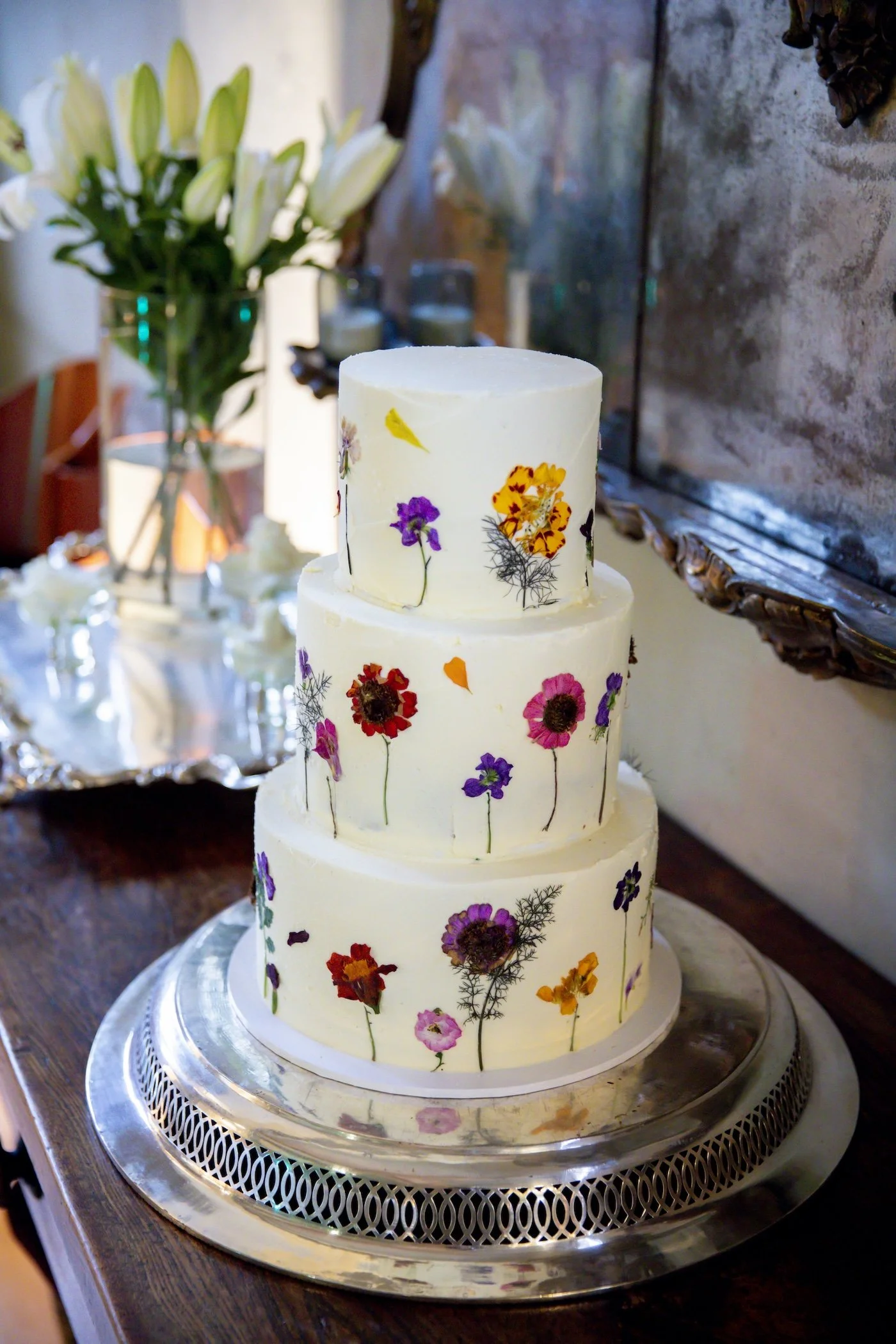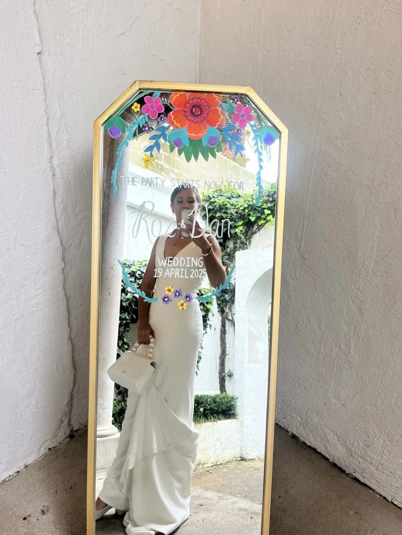 We loved adding personal details throughout the day. Instead of a traditional welcome sign, we had a vintage mirror with a gold frame, hand-painted by our friend Missy Fleming (of Miss Melicious Cakes fame), who also created our wedding cake — and yes, people actually went back for seconds.