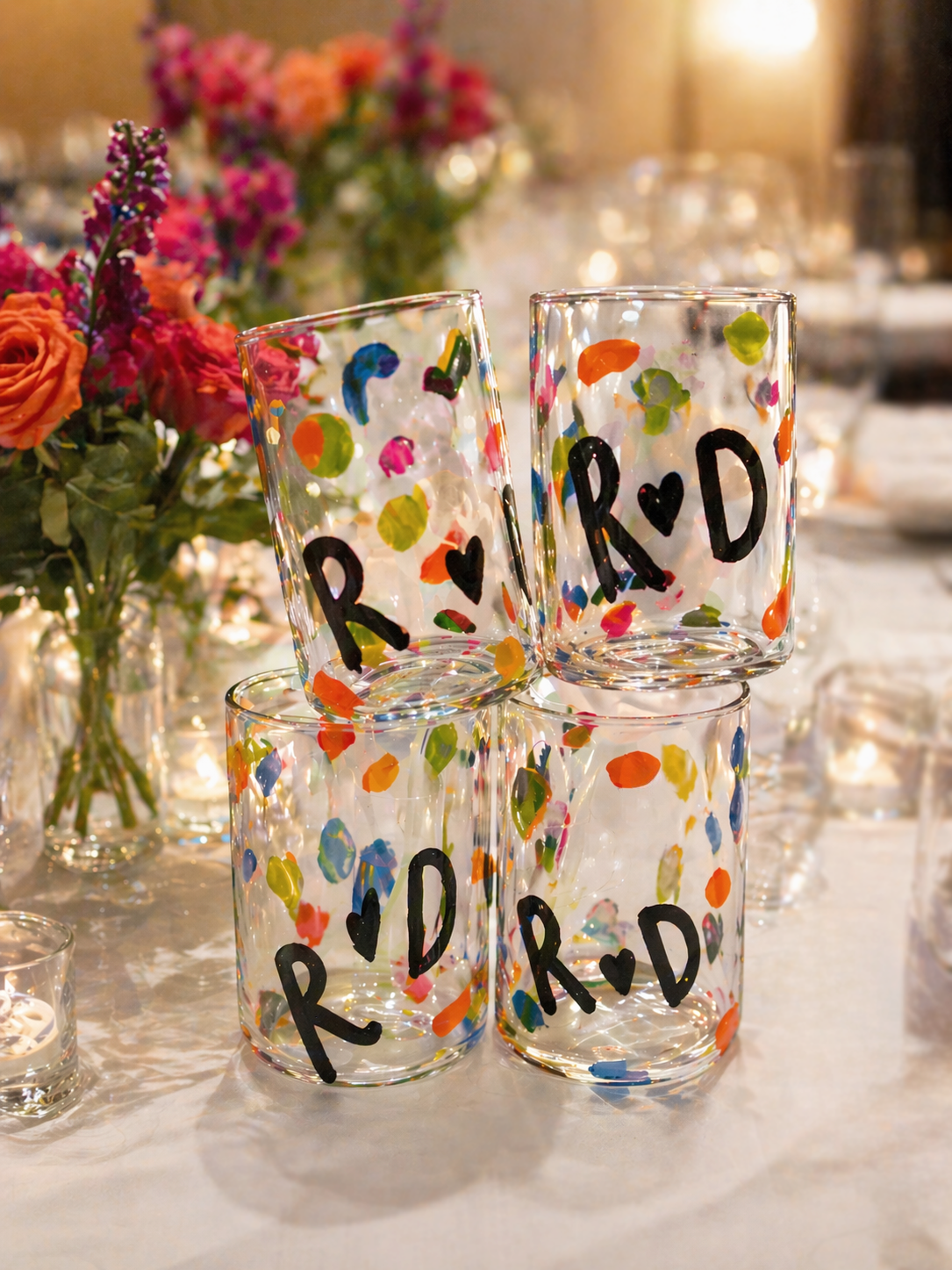 We gifted our wedding party, bespoke hand blown tumblers by Kate Mitchell, designed in our wedding colours and personalised with our initials. We loved them so much we also ordered extra glasses and a carafe for ourselves — such a special keepsake from the day. For our guests favours we had shot glasses engraved with Roz & Dan and our wedding date.