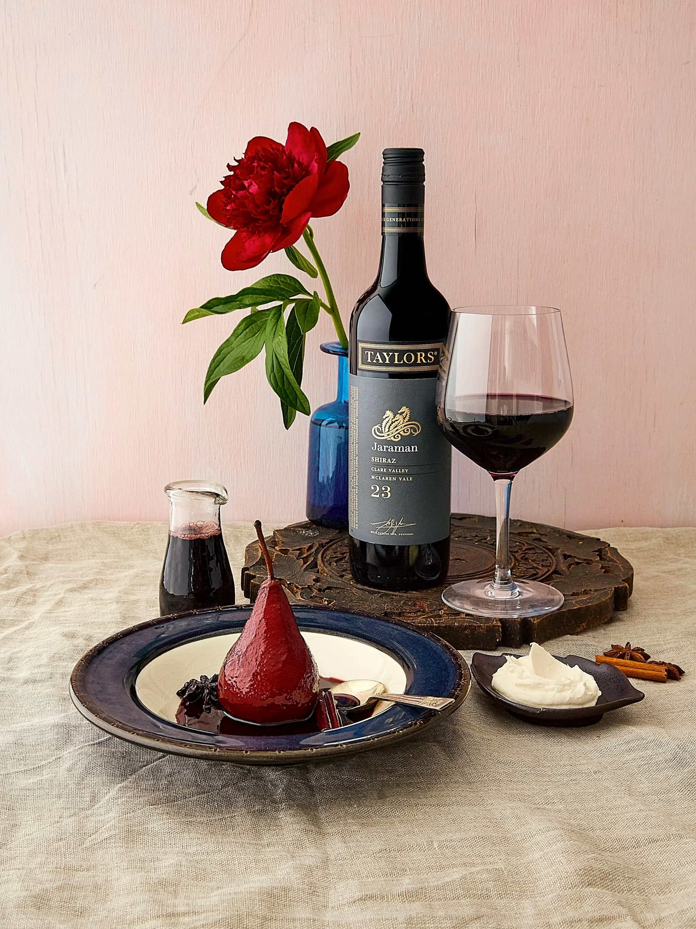 Firm-ripe pears are gently poached in Taylors Jaraman Shiraz 2023 with brown sugar, citrus, cinnamon and star anise, creating a jewel-toned syrup that echoes the wine’s red-fruit vibrancy. Served with mascarpone or ice cream, this luxurious dessert mirrors the Shiraz’s elegance and aromatic complexity — a beautiful finale for any special meal.