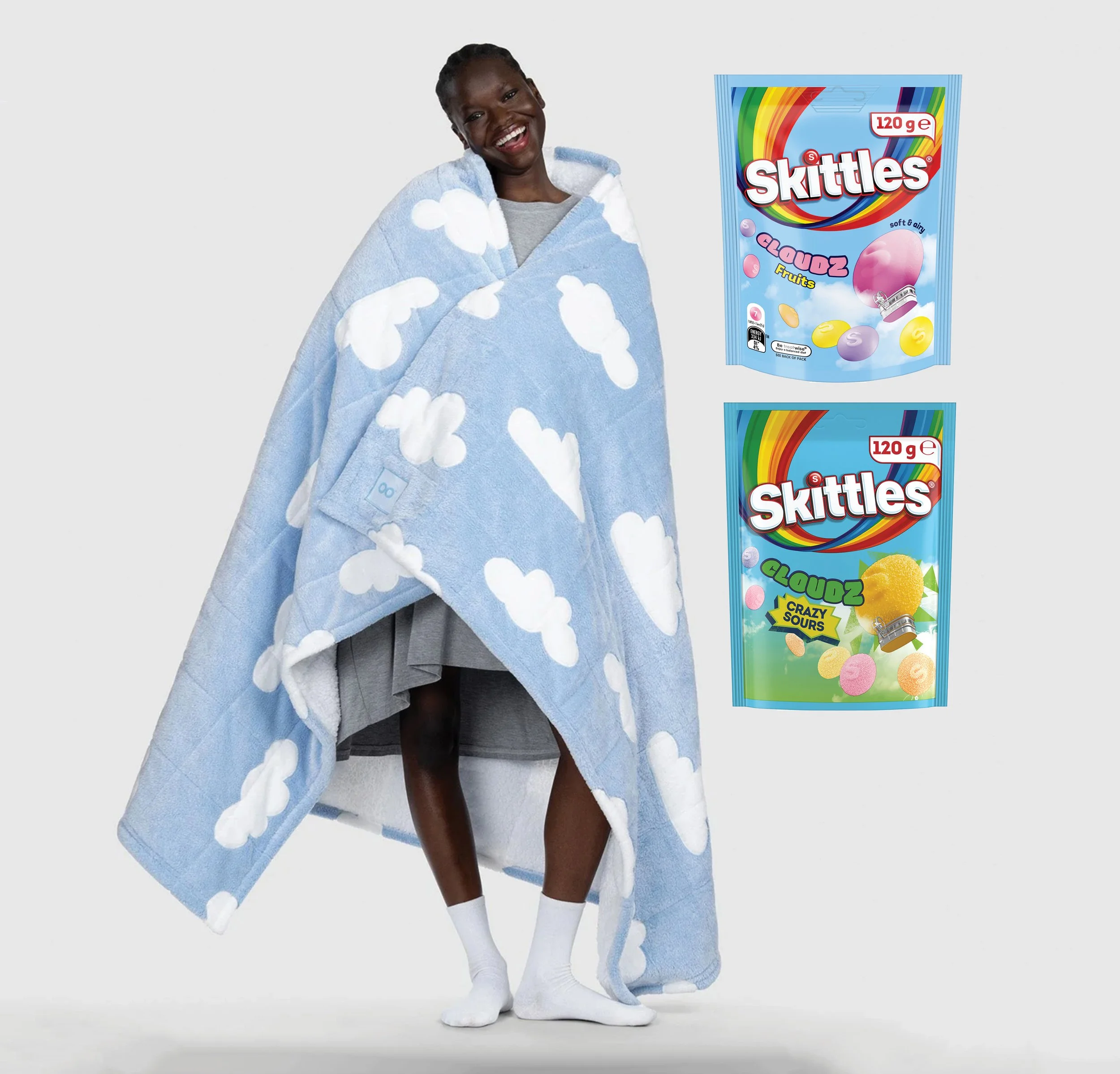 Enjoy the Skittles Cloudz with a cosy Cloud Oodie™ Sherpa Blanket! Made with ToastyTek™ flannel fleece outside and sherpa inside, it’s super soft and warm. Perfect for cuddling up on cosy nights together while enjoying Skittles Cloudz.